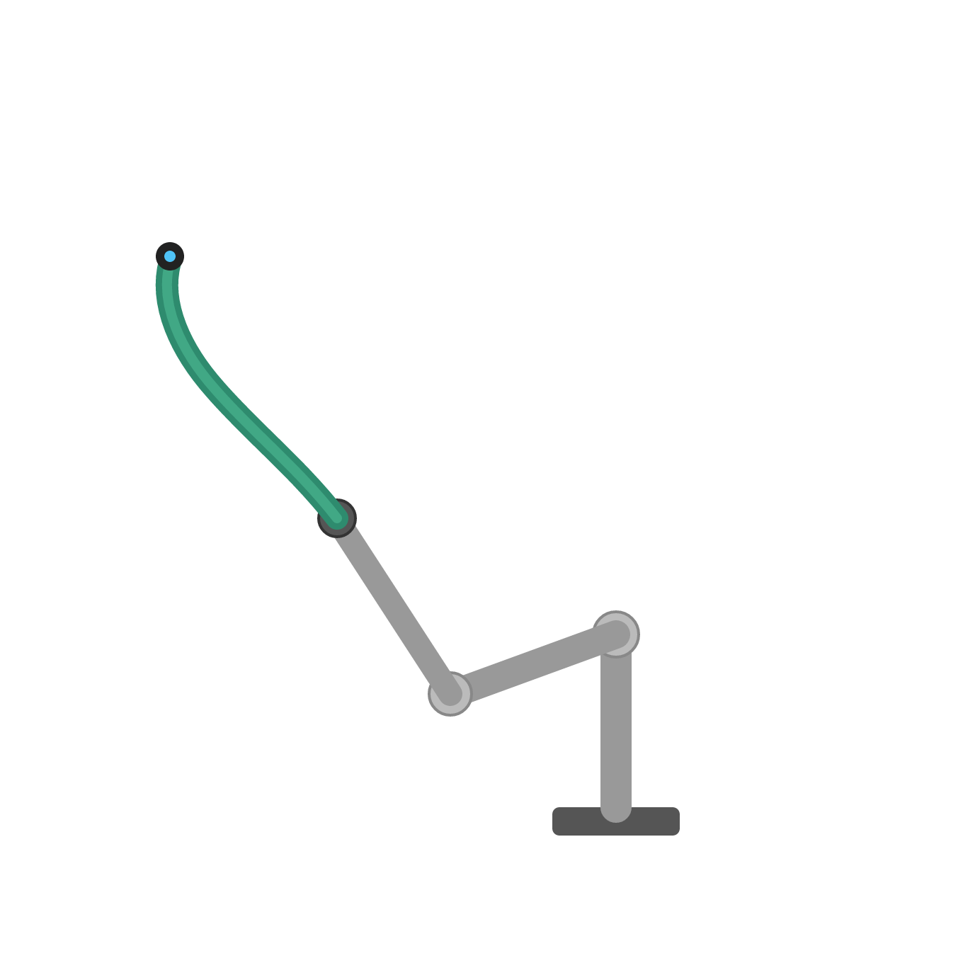Rigid obstacles block the direct path. The planner must route the arm around them while maintaining collision-free rigid-segment motion.